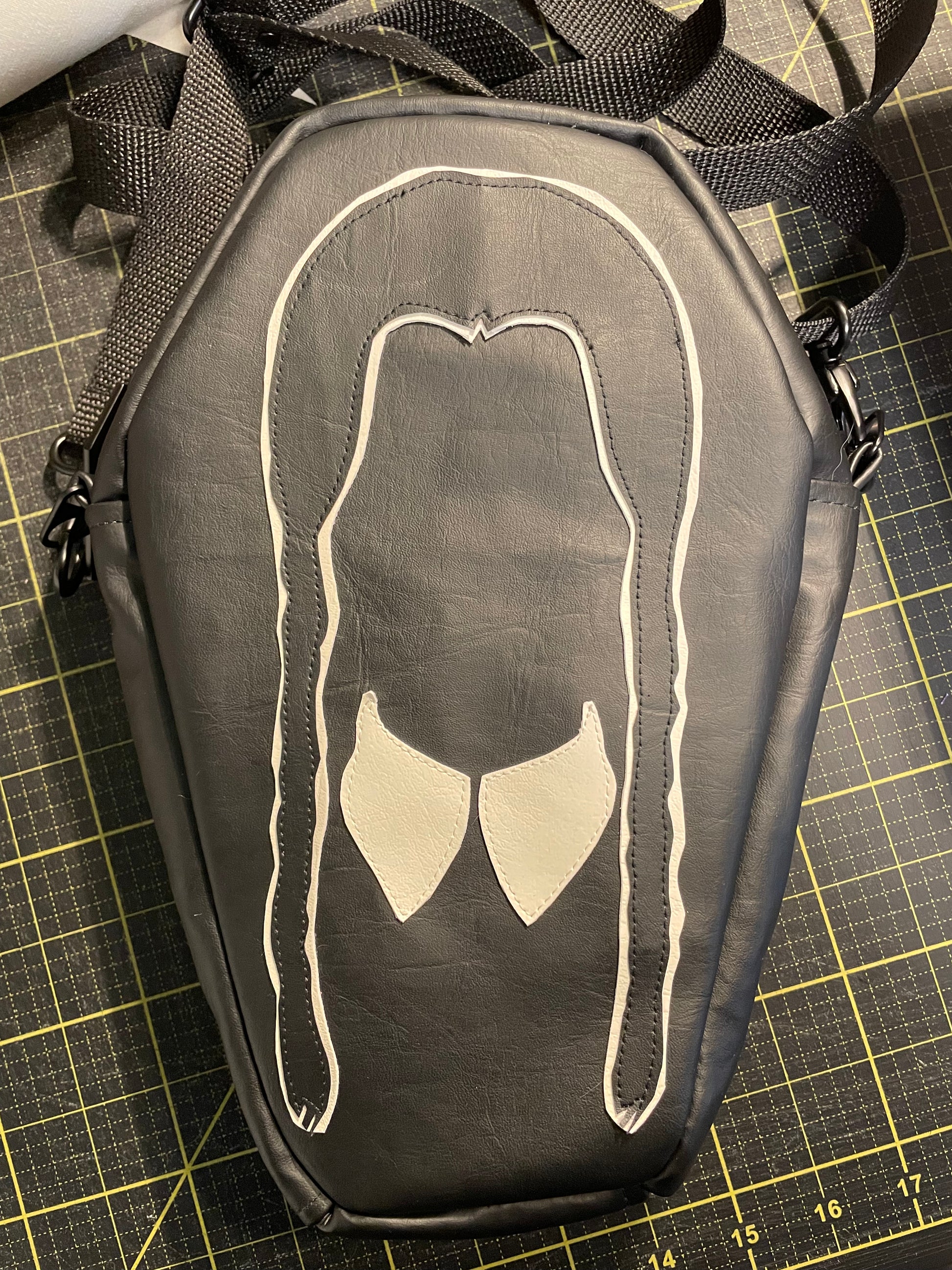 Woe bags are handmade with a vinyl exterior which features our original custom appliqué detail and have matte black hardware. The interior is fully lined with cotton fabric. Comes with webbed crossbody strap
