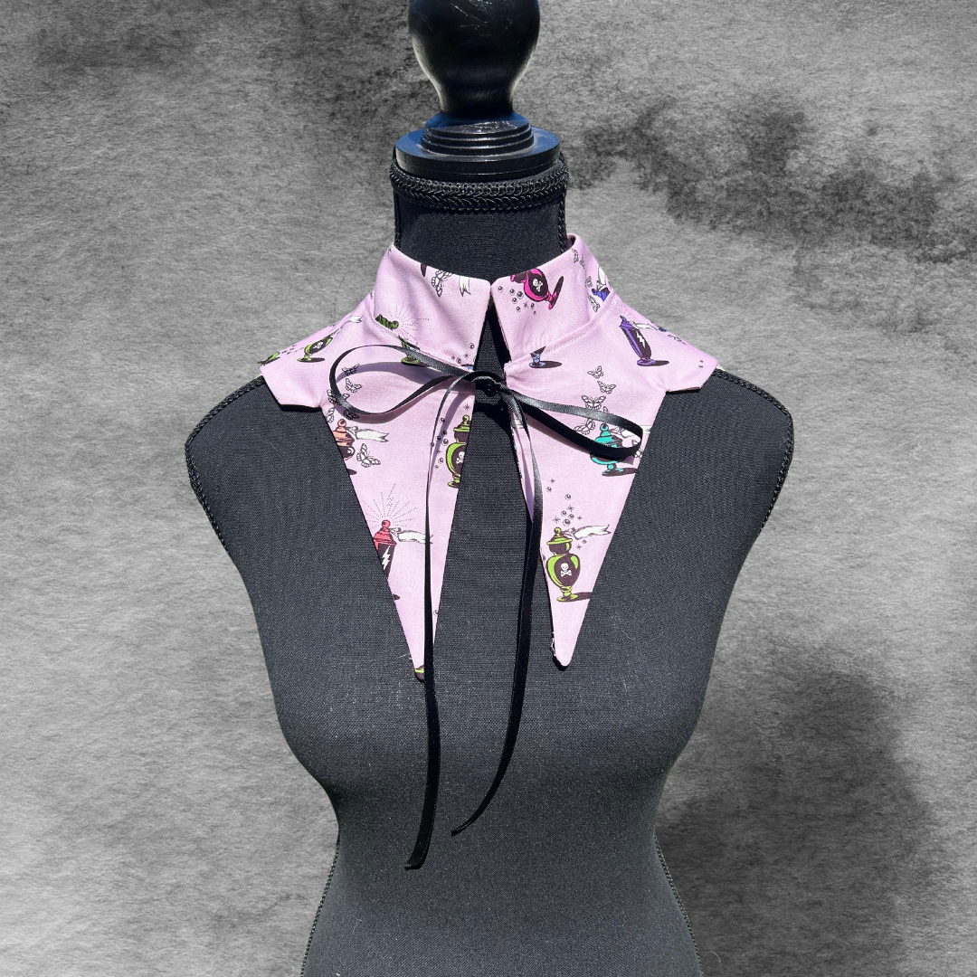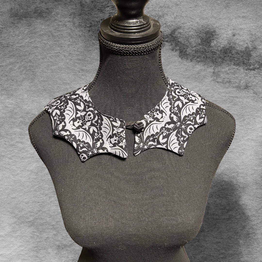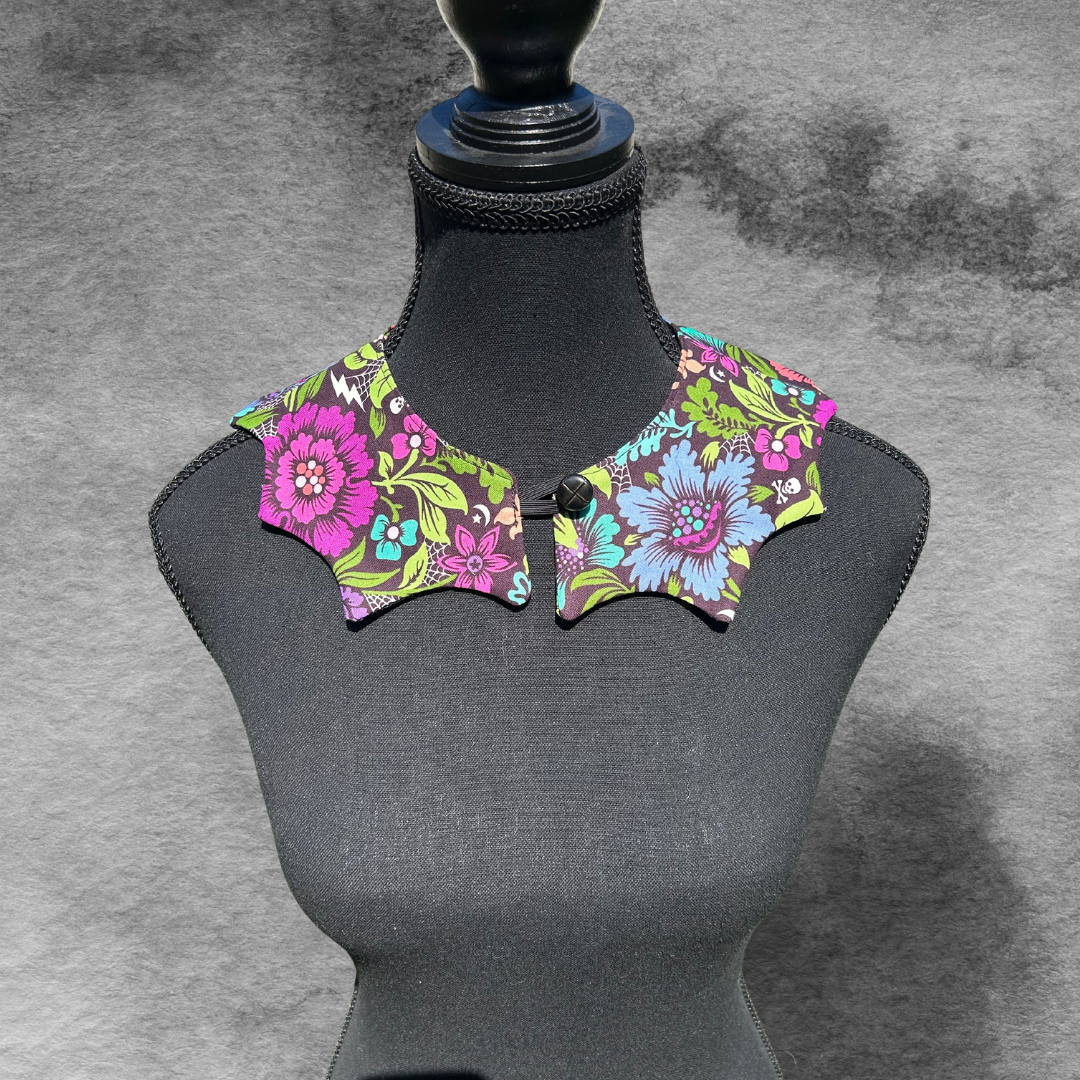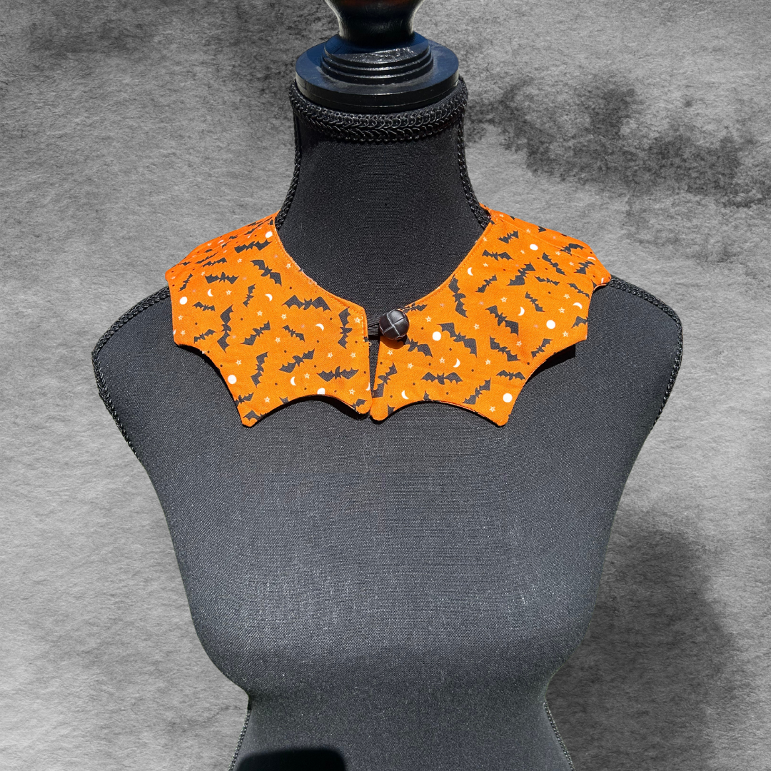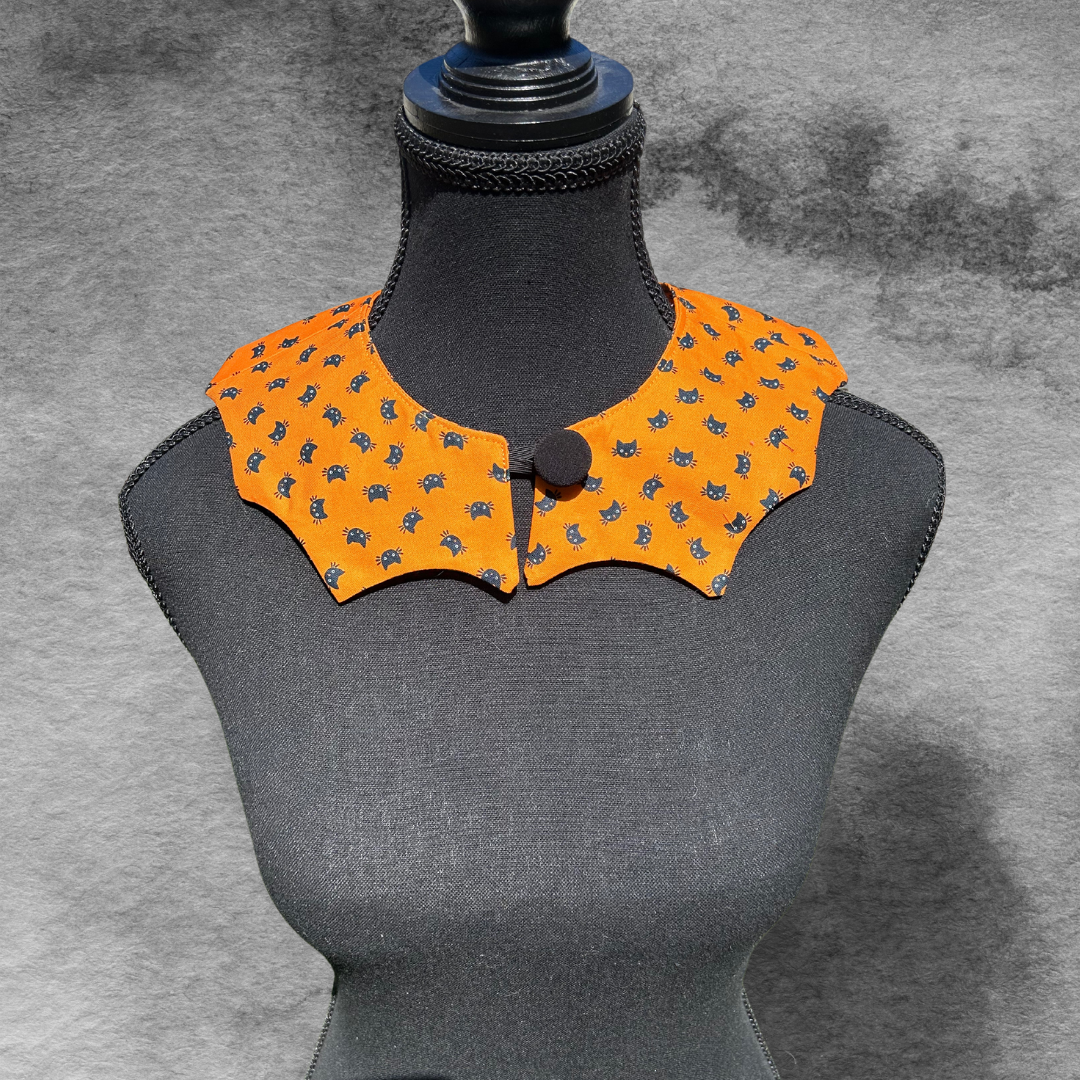 Add some Halloween flair to your outfit. These collars are made from a variety of prints and three designs are available. If your favourite is sold out, please drop us a line to order one of your own!