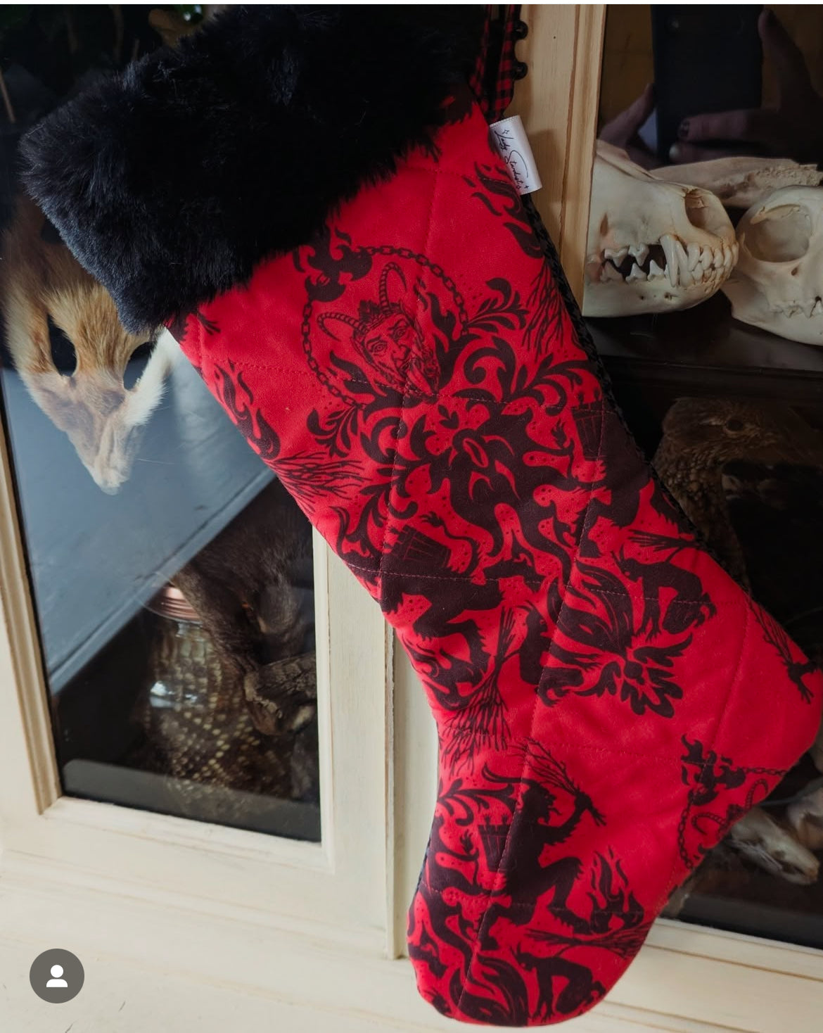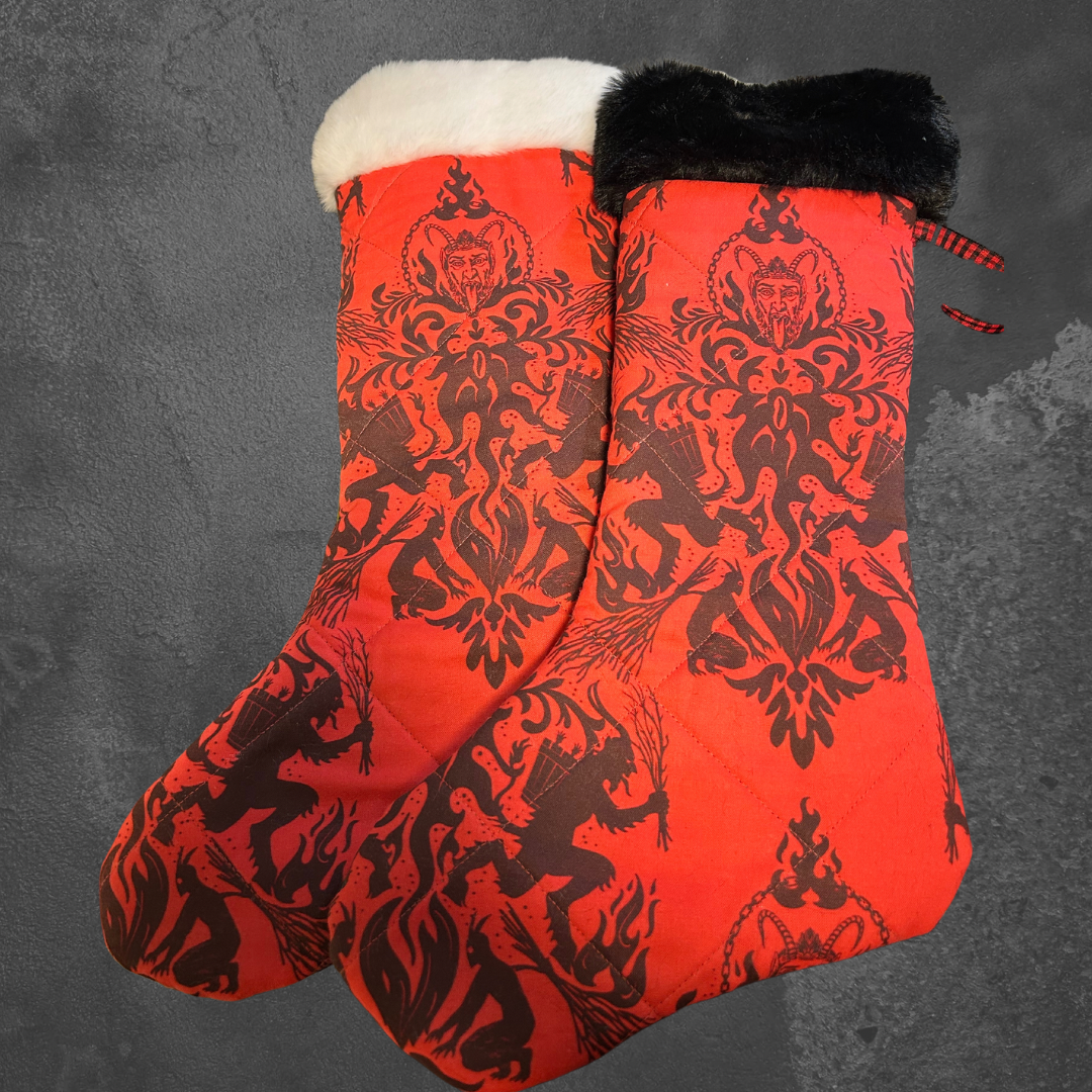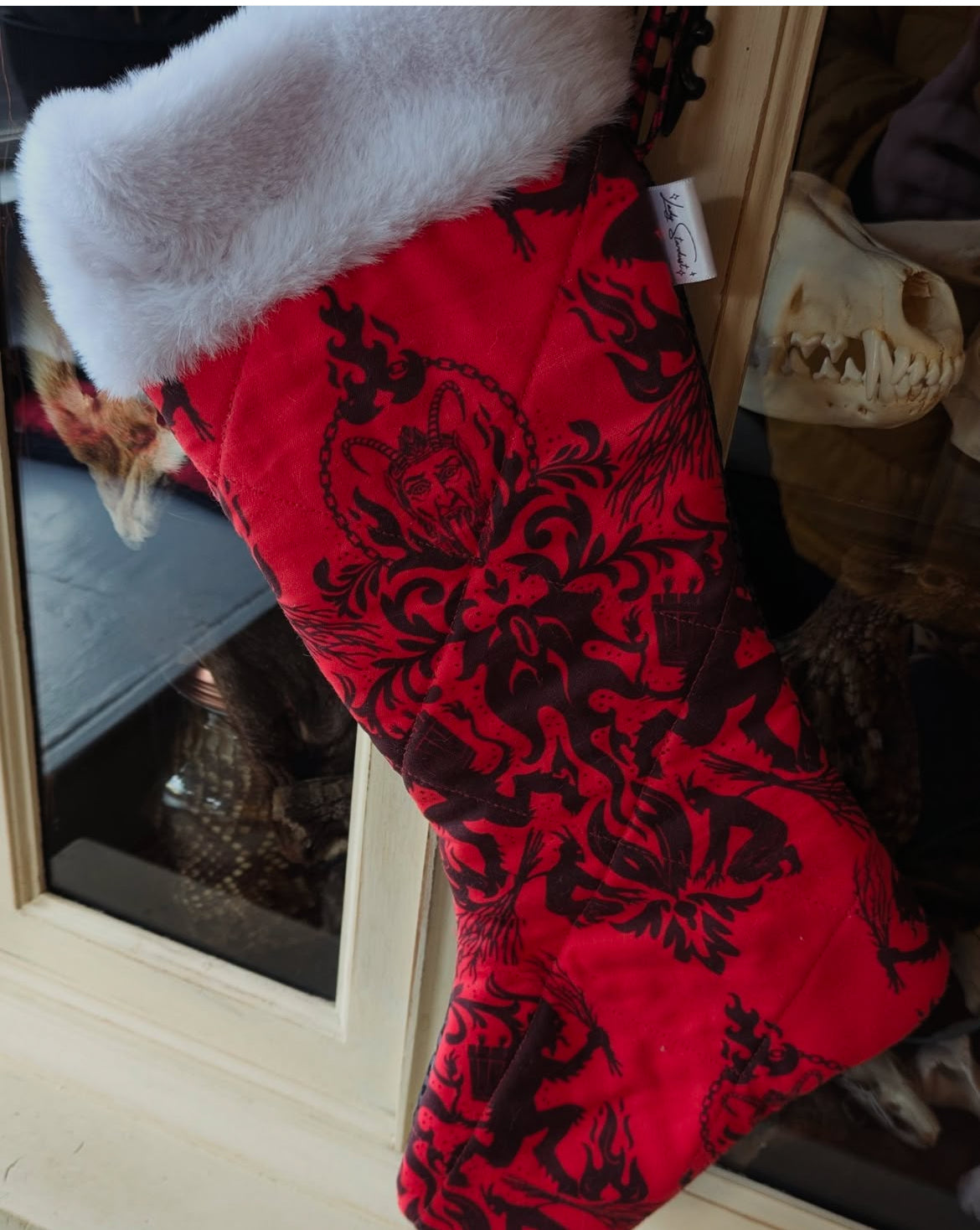 Celebrate the denzien of darkness this winter. This fun Krampus print stocking is quilted front and back, has your choice of faux fur trim, and has a ribbon loop for hanging.