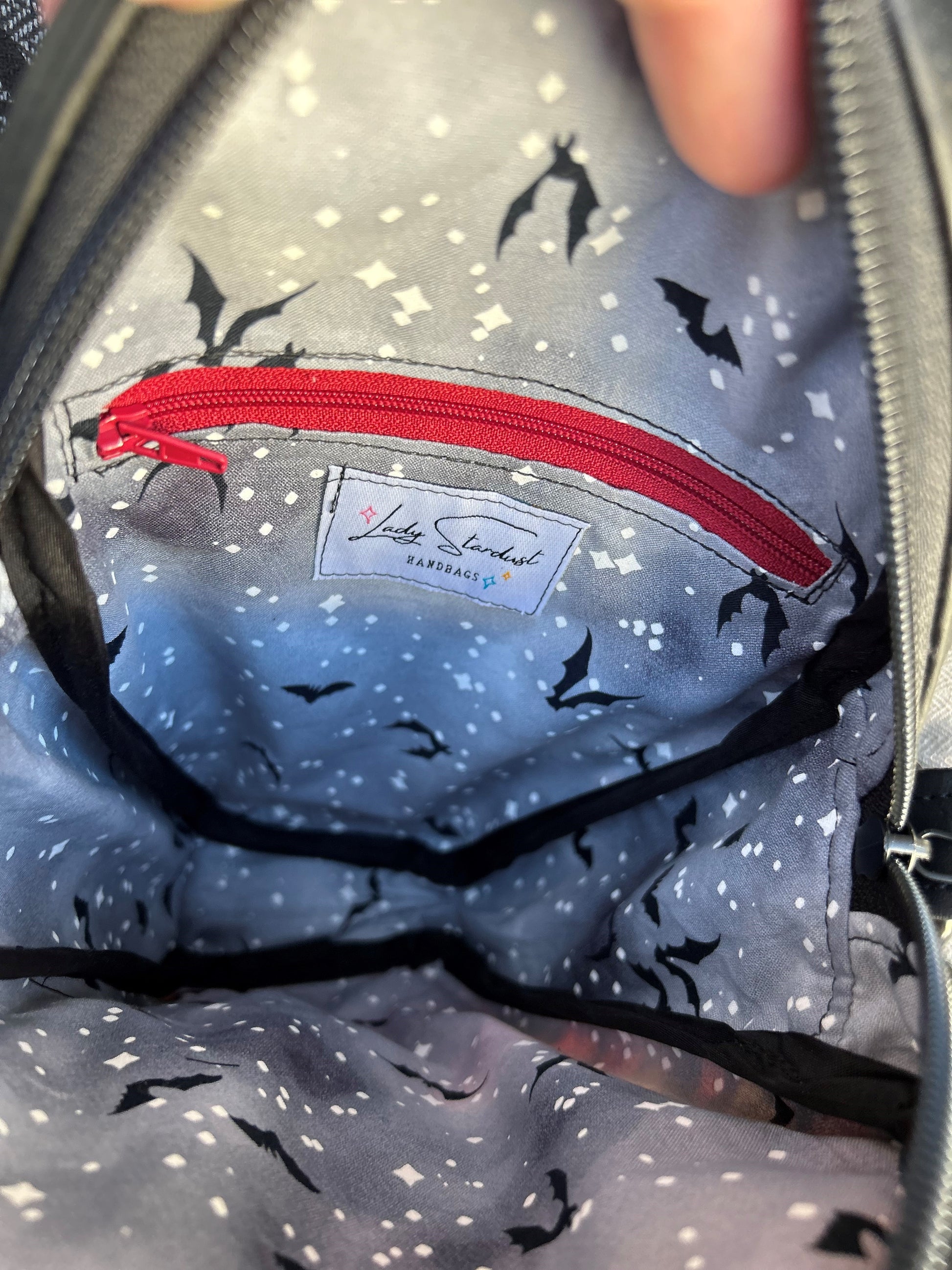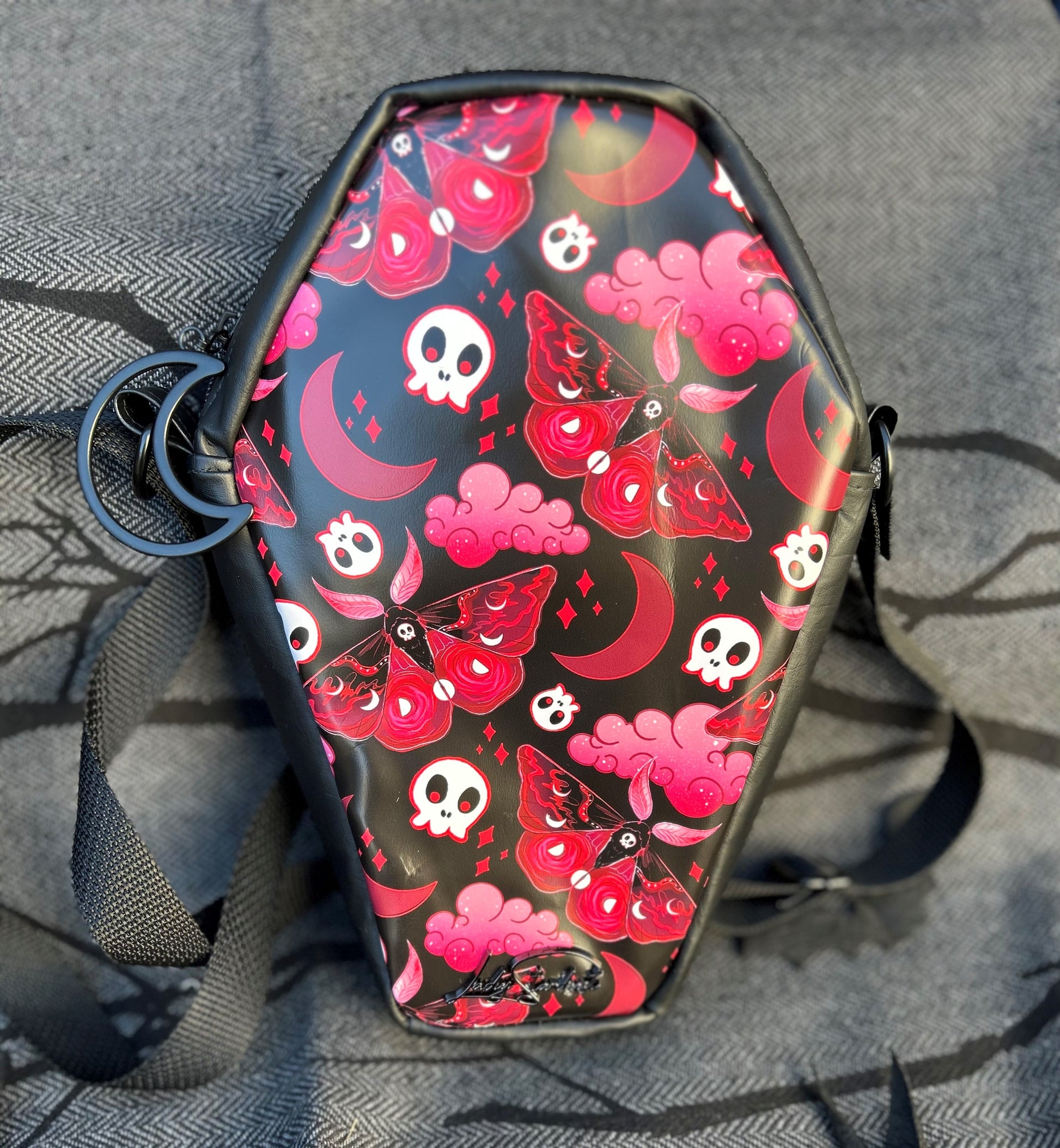 This crossbody coffin bag features custom designed vinyl and is ready for a spooky outing or everyday. The inside is fully lined with a high quality cotton interior. This bag features a large coffin zipper pull. 60” adjustable strap included.